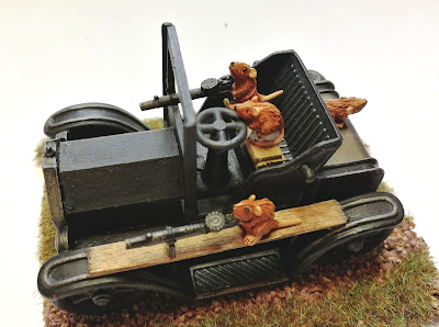 The Rat-mobile was given to me by a friend. It began life as a novelty pencil sharpener! A new paint job, some machine guns, some bits of packing crate so the crew can see over the dash board......all come together to make another useful addition. It also goes to show just what you can find that can be very useful and cheap!